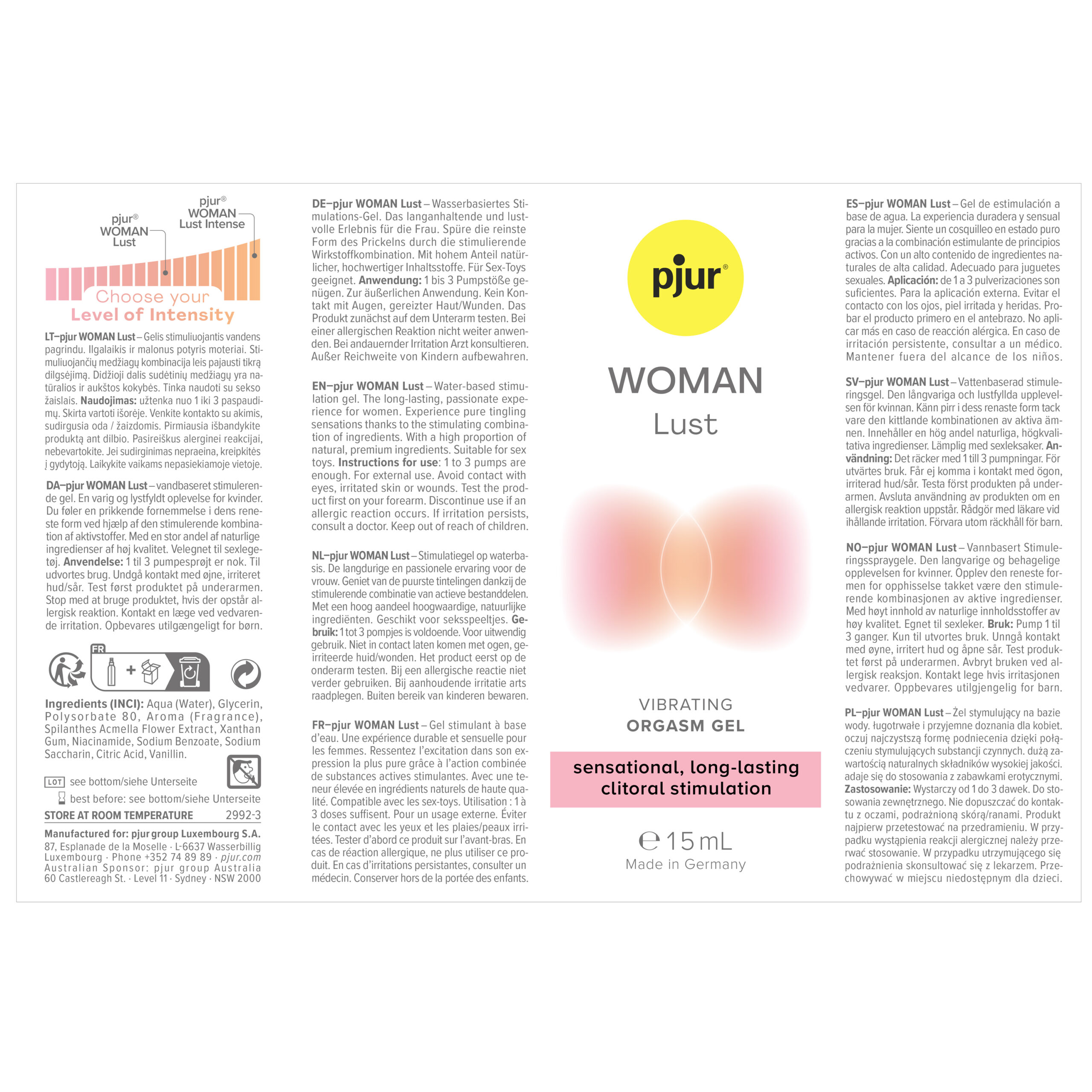 The water-based formula allows you to intensify your experience however you enjoy sex. With pjur WOMAN Lust, you can explore new sensations and discover tingling pleasure beyond anything you’ve experienced before. The unique, natural blend of effective ingredients provides an indescribable, long-lasting experience.